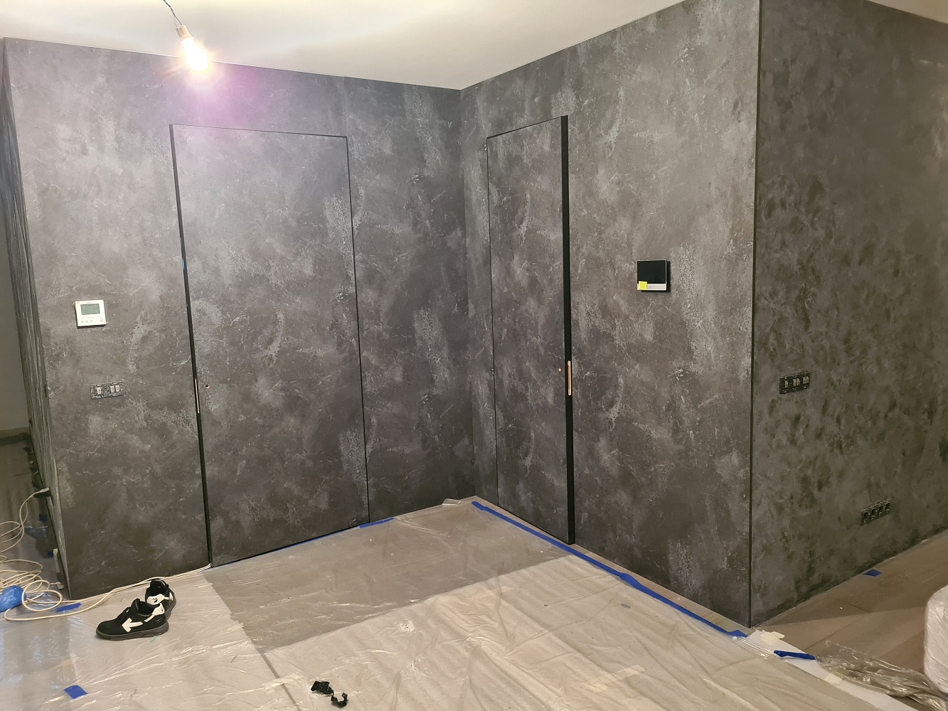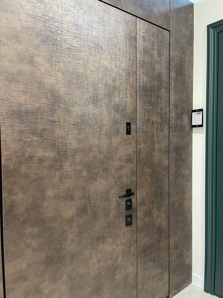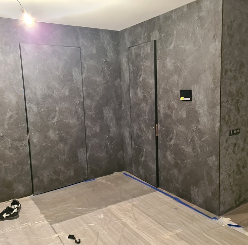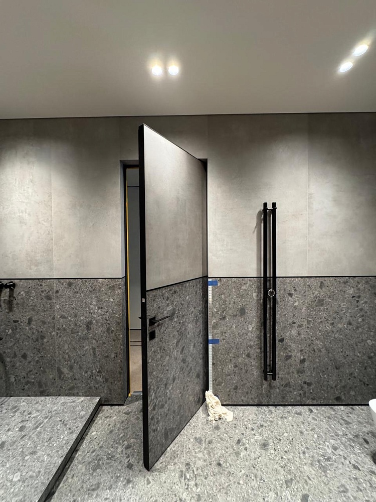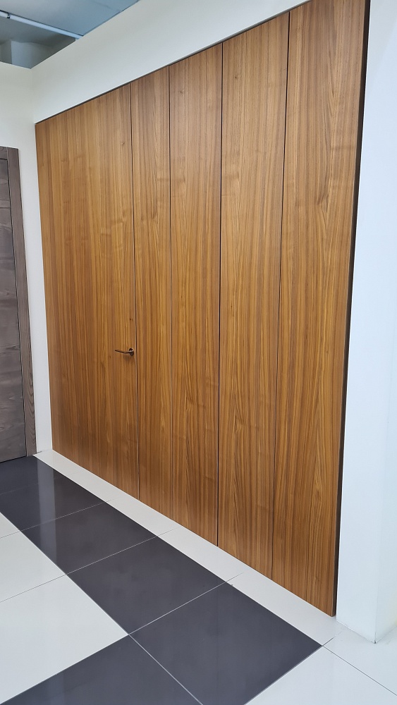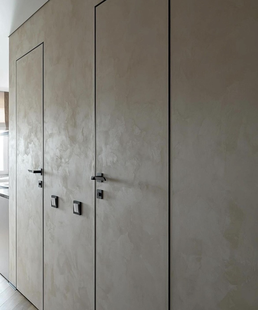 Современно и эстетично. Добавить графичности или сделать акцент именно на скрытой двери помогут современные отделки, например, шпонированные панели или оформление антивандальным материалом с имитацией природного камня. Бонус - возможность изменения облика в соответствии с новыми требованиями интерьера.
