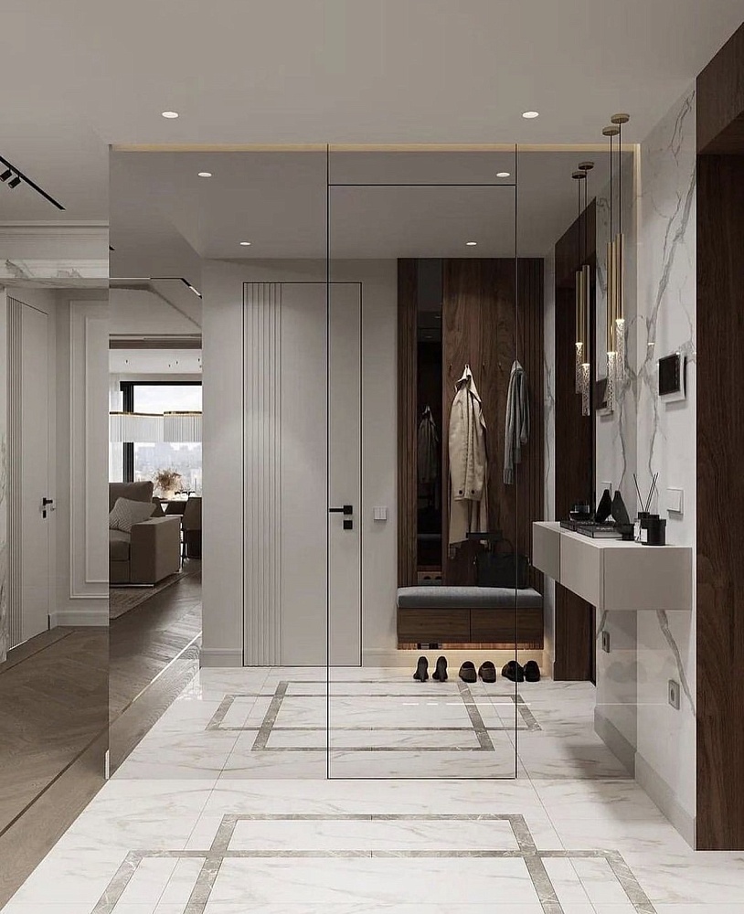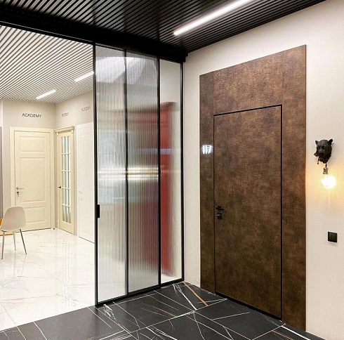 В производстве дверных полотен распространены стеклянные, пластиковые и металлические материалы. Использование зеркал и отражающих поверхностей рассеивает свет, что позволяет визуально увеличивать площадь квартиры.
