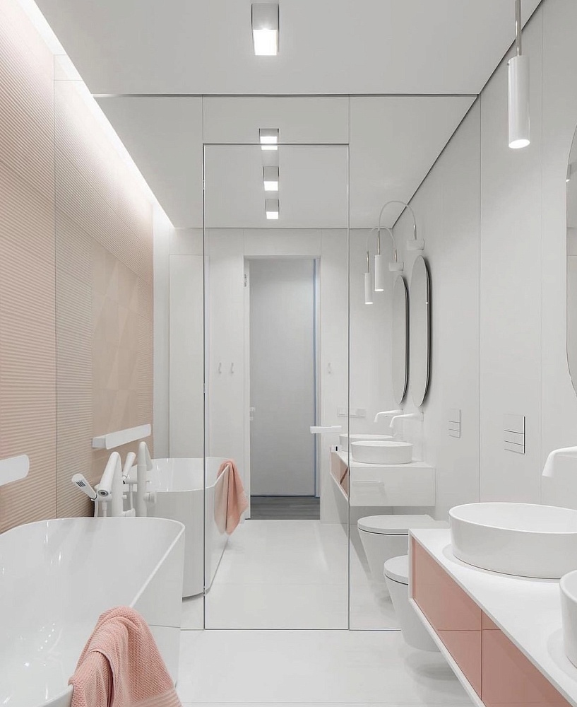Лёгкость и изящество в каждой детали. Скрытые двери со стеклом разгружают интерьер, способствуют